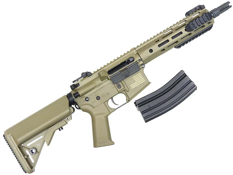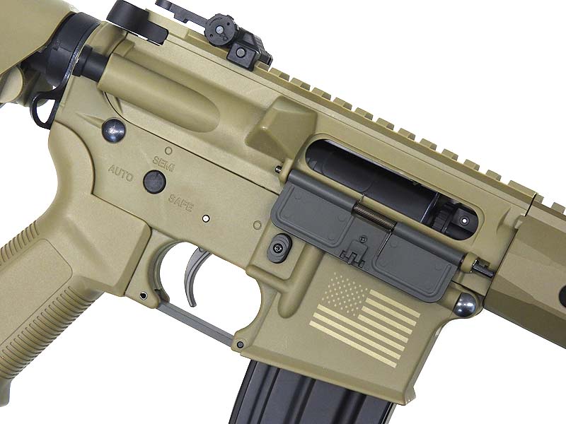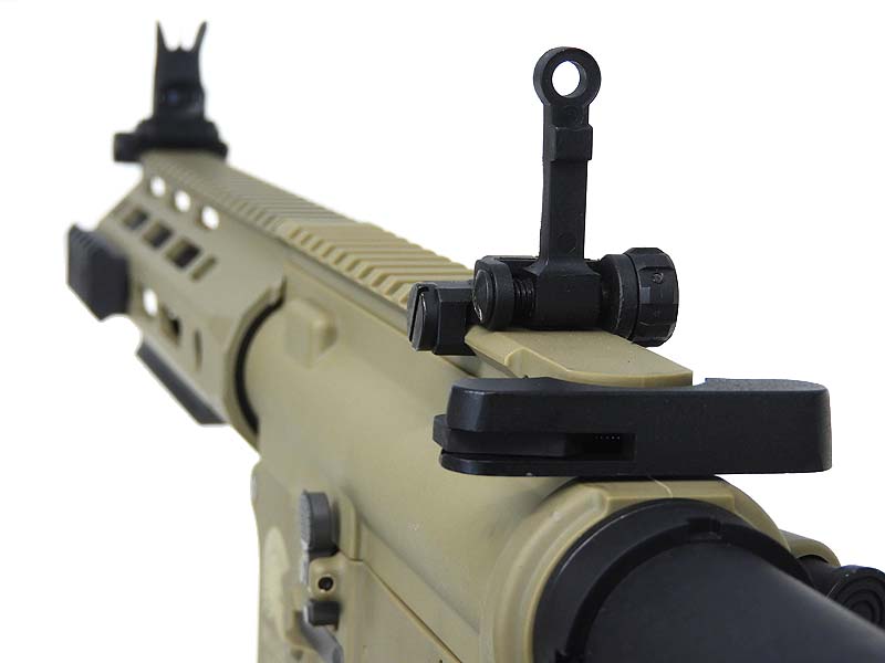 このモデルの最大の特徴であるURX(アッパー・レシーバー・エクステンション)4ハンドガードは数あるM4系ハンドガードの中でも特に使い勝手がよく、キーモッド仕様から始まり現在ではM-LOK仕様となり、時代のニーズに合わせたアップデートされている。常にM4カービンの進化をリードしてきたメーカーが生み出した製品だけに、シンプルで使いやすいデザインとなっている。ボディカラーもトレンドのTANカラーで全体を統一してあるので、最新スタイルでのコーディネイトにも最適。
