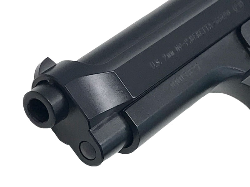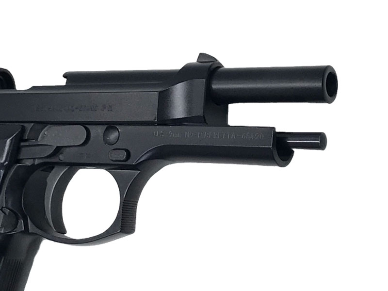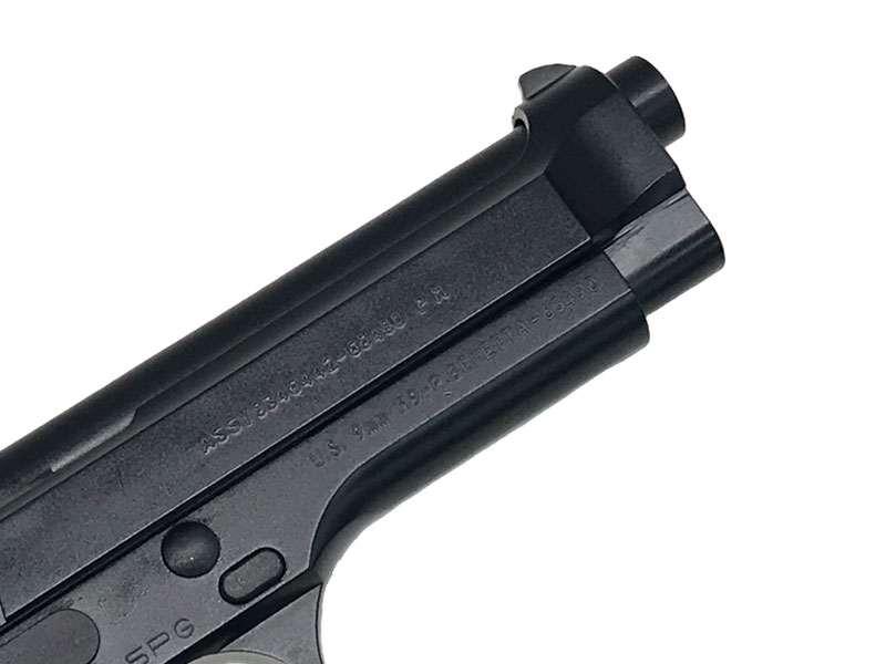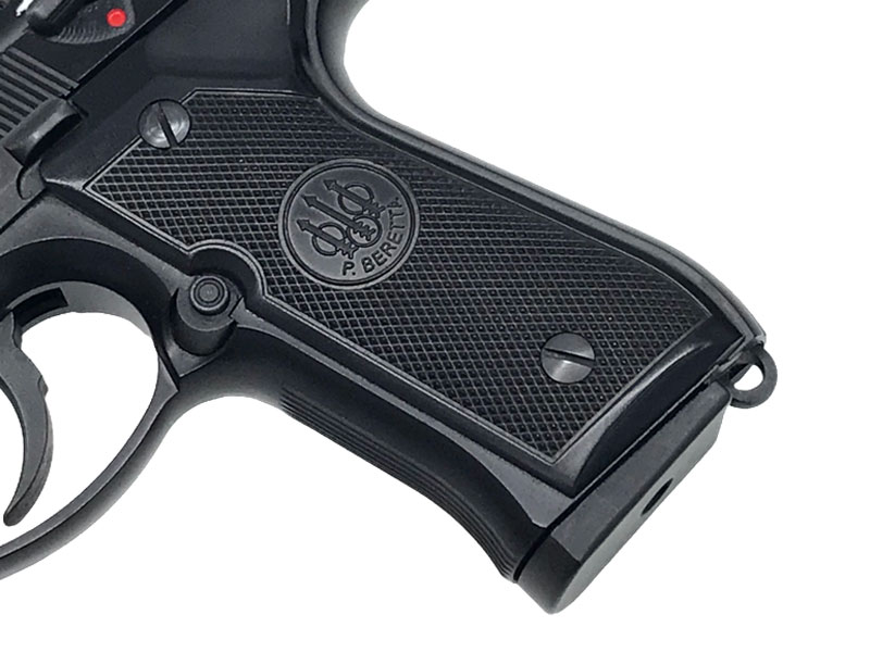 ボディには衝撃に強いABS樹脂を使用。実銃を忠実に再現した造形が魅力的である。フレーム、スライド、グリップパネルに至るまでしっかりと刻み込まれた刻印にはもちろん「P.BERETTA」の文字とベレッタ社のロゴが堂々と刻まれている。また、デコッキングはもちろん、ローディングインジゲーター、ファイアリングピン・キャッチまでも完全に再現。ボディはABSではあるが、亜鉛製ハンマーの一部だけスチール製にするなど負担のかかる可動部品は金属でできているため、強度、性能、質感も十分。性能とディティールにしっかりとこだわった逸品となっている。