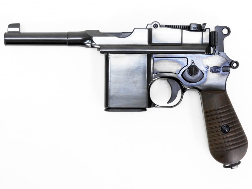 1896年にモーゼル兄弟(ヴィルヘルム・モーゼル、ポール・モーゼル)が開発した。このデザインは弾倉が銃把の前にあるため重心が前にあり、射撃競技銃のように正確な射撃が可能であり、ストックを併用するとカービンとして使用できた。「箒の柄(ブルームハンドル)」とあだ名された独特の形状をしたグリップは、掌の小さな小柄な民族でも関係なく使用できる利点があり、そのまま採用され続けた。この銃は馬上などでも使いやすいということで、清朝末期以降の中国の軍人や馬賊にも愛用された。同銃は100万丁以上生産され、旧式化してもなお中国を最大のマーケットとして1936年まで生産され続け、チャーチル・金日成・ホーチミンといった当時の著名人にも使用されている事でも有名である。他の自動拳銃に比べて倍近い価格だった事や、目を引くデザインだった事からステータスシンボルでもあり、まだ信頼性の低かったマガジン給弾式に比べて、信頼性の高い固定弾倉式だった事で、20世紀前半で最も知られた自動拳銃となった。(by wikipedia)