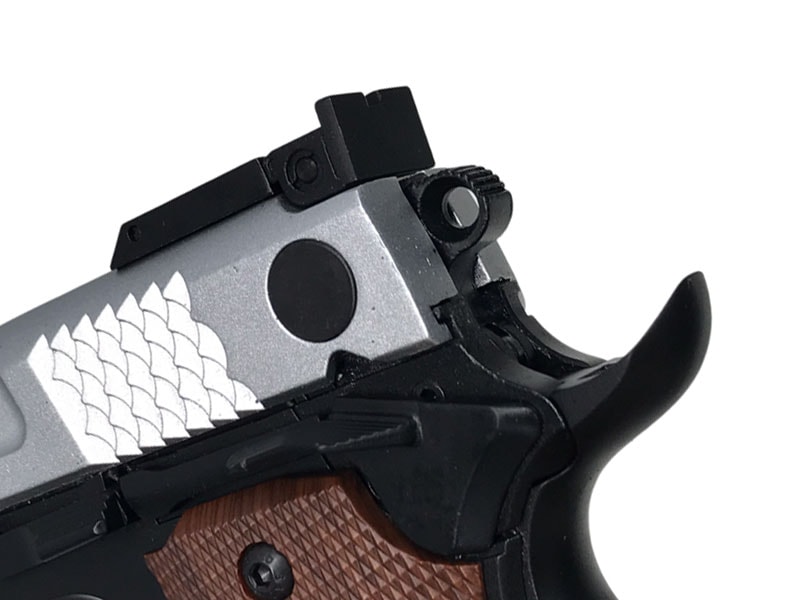 最大の特徴である球状可動ブッシングは再現されていませんが、S&W 3RDオートマチックから通じるスライド幅やグリップ角度など、後のSW1911とは異なる点は再現されています。
