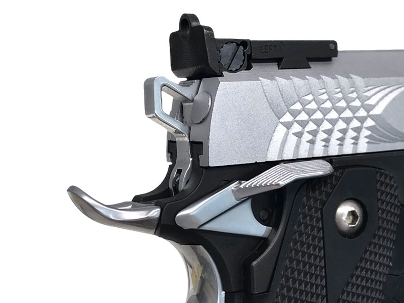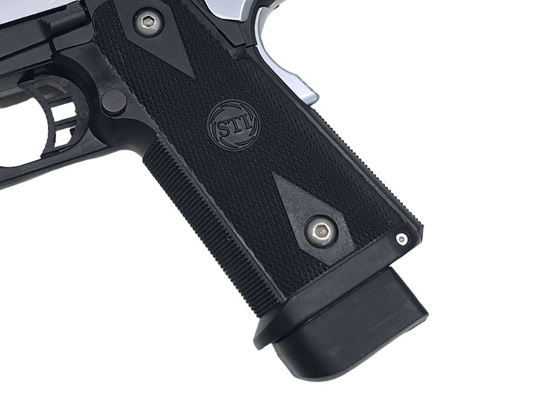 ワイドシャーシを開発してSTI社の有能さを見せつけた一挺。ストリートファイト&ディフェンスからコンバットシューティング競技に至るまで、マルチパーパスユースのコンバットピストル。銃身長5インチ。左右両側から操作できるアンビセフティ、上下左右微調整可能なリアサイトなど、一級のパーツで武装。 97年から戦列に加わったワイドフレイムの中心モデル。フレイム強化を含めスコープ、ダットサイト、フラッシュライト、レーサー等のマウント装着時にも十分な強度をもつ。