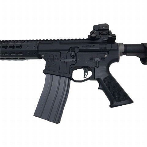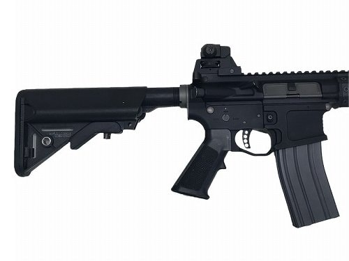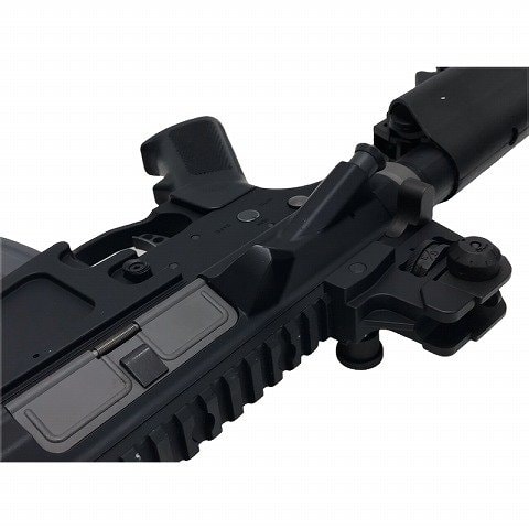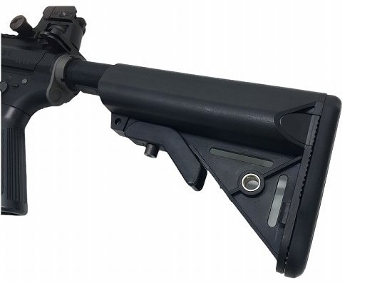 その驚異的な剛性にくわえ、フリーフローティング方式のヘビーバレルや、Mega専用のボルトユニットなどを完備。まさにハイスペックを極めたM4といえる。またレイル奥にあるガスピストン・ユニットはダミー可動式で、LMT型の着脱式サイトとクレーンタイプ・ストックを標準装備する。