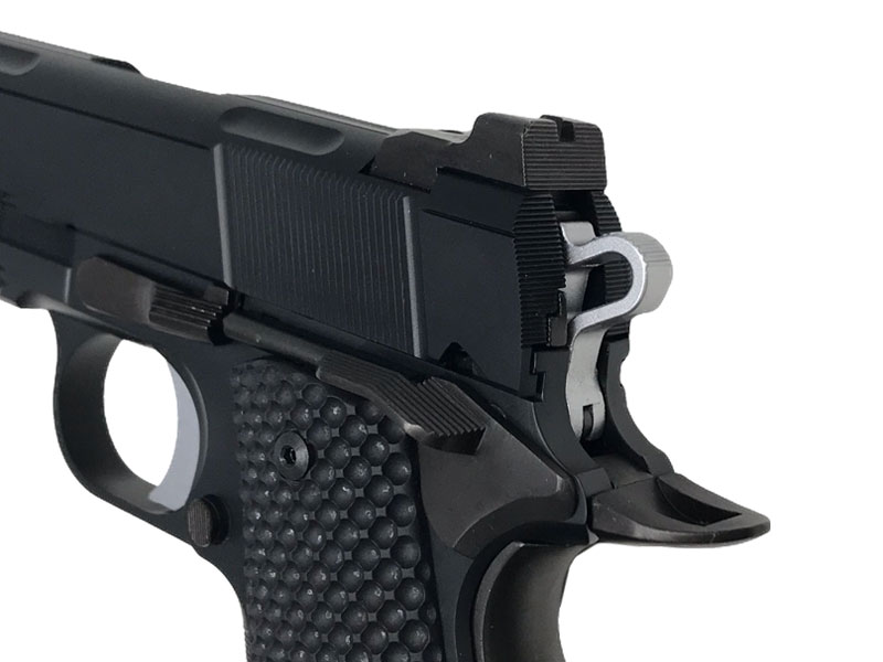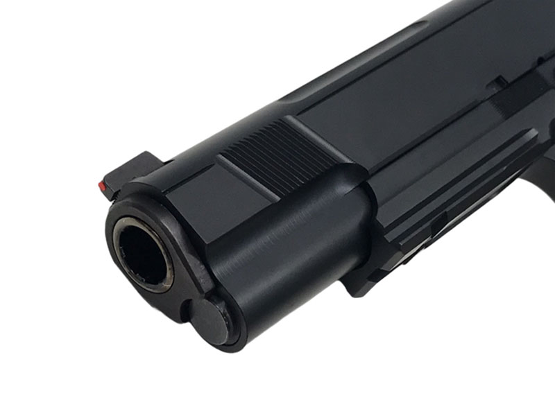 ミラーカスタムコスタ.ver/黒染め」ホールドオープン後に弾丸の装填されたマガジンを挿入し(もしくはマガジンを抜き取り)、スライドを引く事でスライドストップをリリースできるPBシステムを搭載。