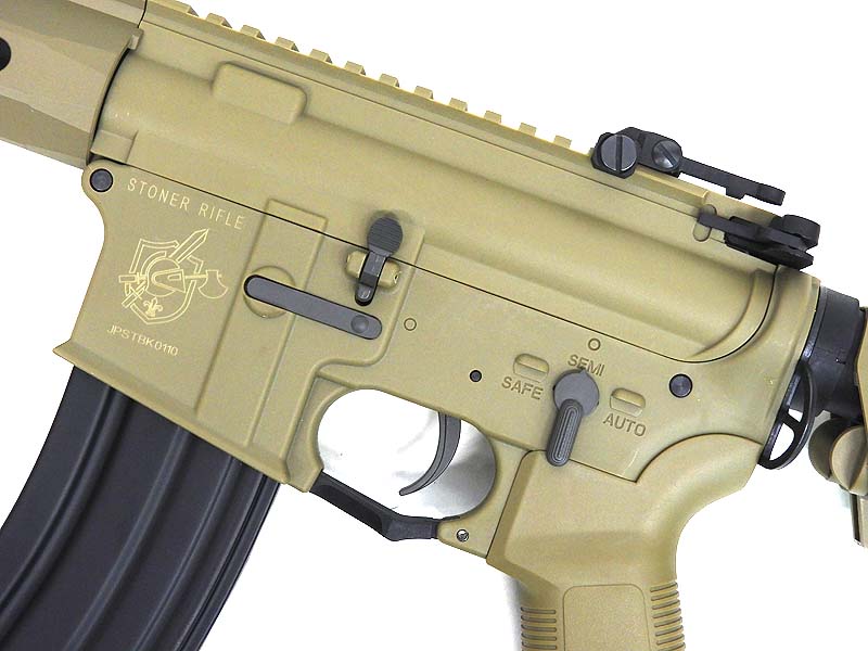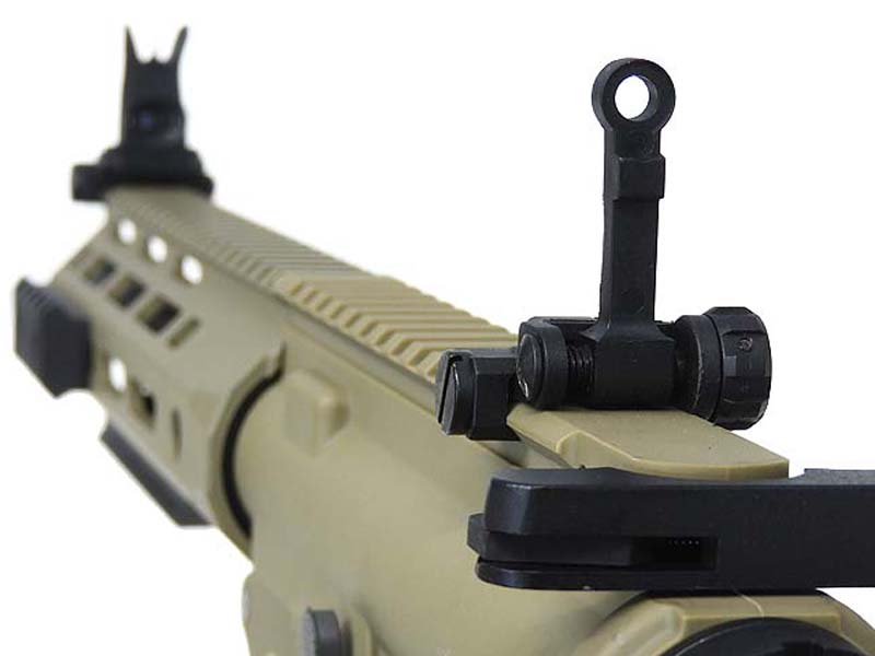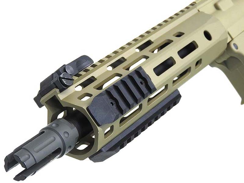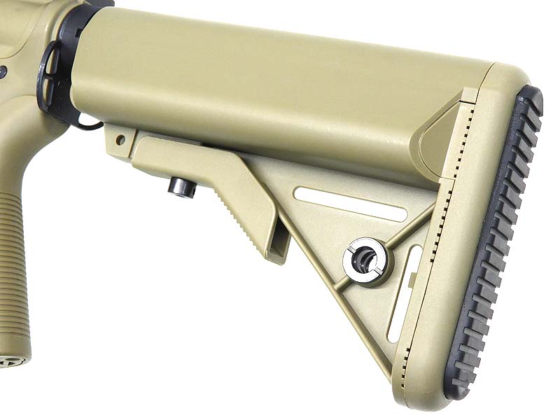 このモデルの最大の特徴であるURX(アッパー・レシーバー・エクステンション)4ハンドガードは数あるM4系ハンドガードの中でも特に使い勝手がよく、キーモッド仕様から始まり現在ではM-LOK仕様となり、時代のニーズに合わせたアップデートされている。常にM4カービンの進化をリードしてきたメーカーが生み出した製品だけに、シンプルで使いやすいデザインとなっている。ボディカラーもトレンドのTANカラーで全体を統一してあるので、最新スタイルでのコーディネイトにも最適。