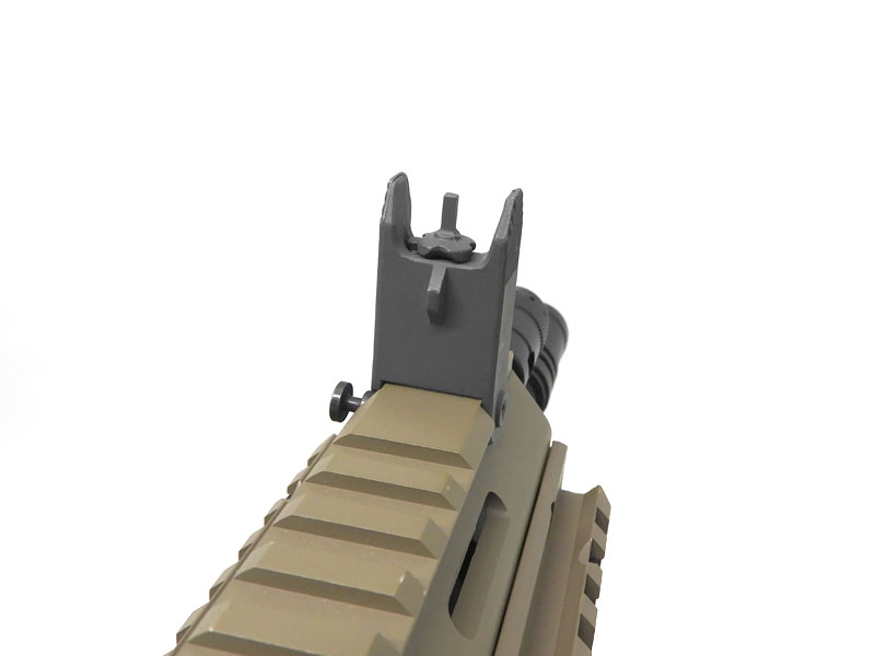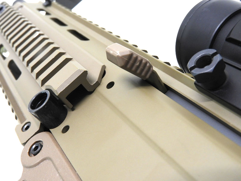 工具を必要としないバレル交換システム。通し番号を備えたCNC加工のピカティニーレイル仕様のアッパーレシーバー。耐衝撃性強化ポリマーを使用したロアレシーバー。マサダロングハンドガードは拡張性の高い米国軍用規格-1913ピカティニーレイル追加の為のスロット付き。セレクター/マガジンキャッチおよびボルトストップは両手利きのアンビシステム。スプリング作動のMBUSフリップアップリアサイト。