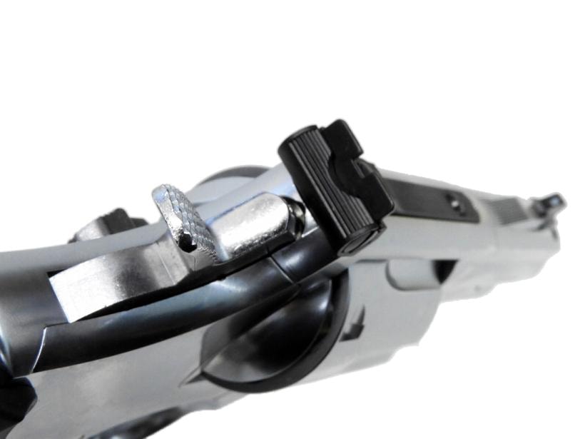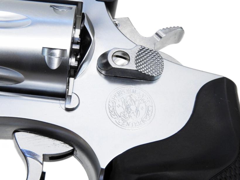 今回この希少な1993年のLew Horton別注モデルを発火モデルガンとして再現しました。トリチウムドットをイメージしたフロントサイトに、ブラックブレードタイプのアジャスタブルリアサイト、スピードローダー対応のカットダウンサムピース、ストッパー付きスムーストリガー、アンクルマイクスタイプのラバーグリップを標準装備した贅沢なカスタムモデルです。通常ラインとは一線を画す、パフォーマンスセンターが送り出すハイエンドな逸品を是非手に取ってください。(7mmキャップ火薬発火仕様。.357マグナムカート6発付)
