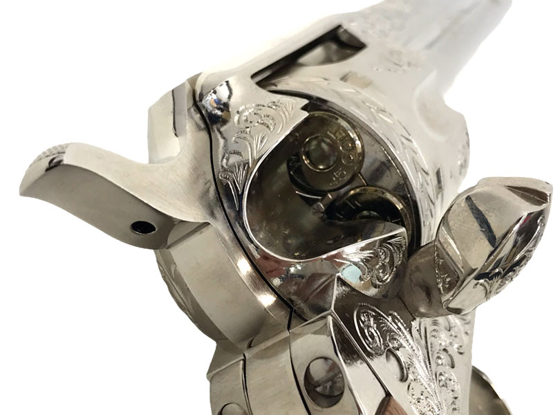 シルバーメッキのボディーに繊細なエングレーブを施した「ルネサンス」モデル。見るものを魅了する圧倒的な美しさ。スムース木製グリップには虹のように輝くコルトメダリオンが埋め込まれている。