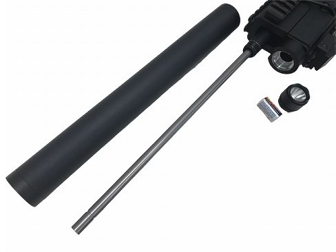マズル上部のライトを格納するスペースにLEDライトを格納、さらにベクターCRBという16インチカービンモデルにするバレルシュラウドを装備したカスタム品です。