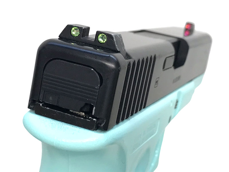 Tiffany & Co. のブランドカラー「ティファニーブルー」をKJワークス製 グロック19のフレームに塗布。フレームの刻印も各所リアル刻印に打ち換えられている。スライドも薄っすらとブルーイングのような仕上げになっており美しく仕上がっている。さらに、リアサイトはグリーンのジュエリー、フロントサイトにはレッドのジュエリーが埋め込まれサイティング中の視認性もしっかり確保、可憐に敵を仕留めることができる。