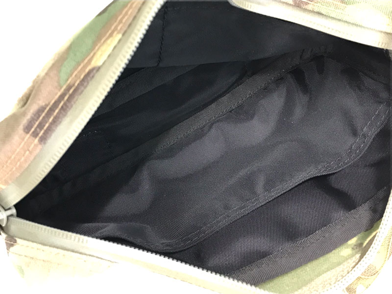 ポーチ本体には柔軟性のある500デニールコーデュラナイロンを使用し、前面モールスリット部分、ポーチ側面のウイング、背面部のプルタブ、側面と底部のアタッチメント部分等、不可の掛かる部分には耐久性の高いスコードロン素材を使用しています。前面モールスリットとウイング部分のモールスリットには、モール対応ポーチ等の追加配備が可能です。ベルクロパイル(メス)部分にはパッチでデコレーション可能。