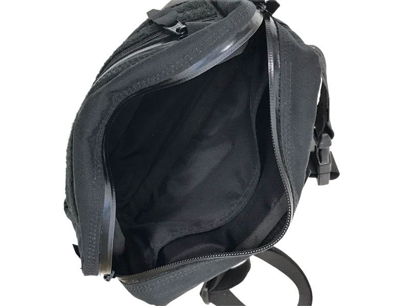 各コンパートメント内側には手触り滑らかなパッククロス生地を縫製配備。メインコンパートメント内部は対面側にスリットポケット×1、外側に2分割したスリットポケットを配備しています。バッグ表面のスリットポケットには手帳やレシートなど、薄い持ち物の収納に便利です。対面部のスリットポケット収納にはクッションメッシュ素材を使用し、人体へのストレスを軽減すると共に衣類を傷めない配慮をしています。また、スリットポケット固定用のベルクロをプルタブを付けて上部に移動した事で収納域も拡がりました。