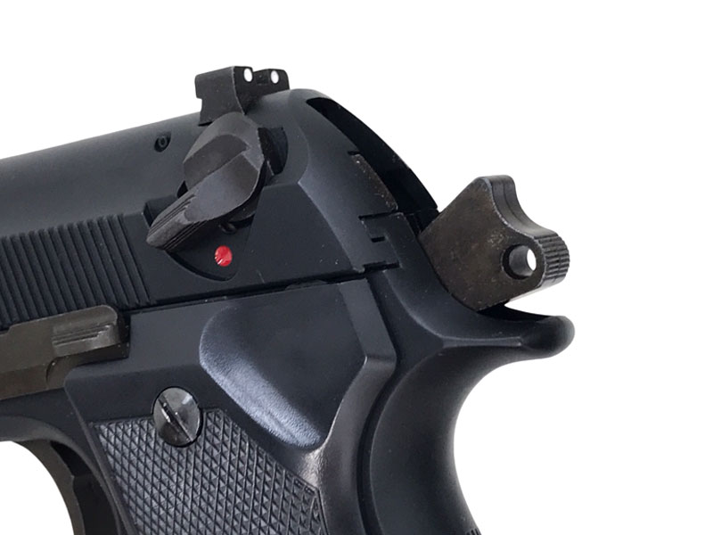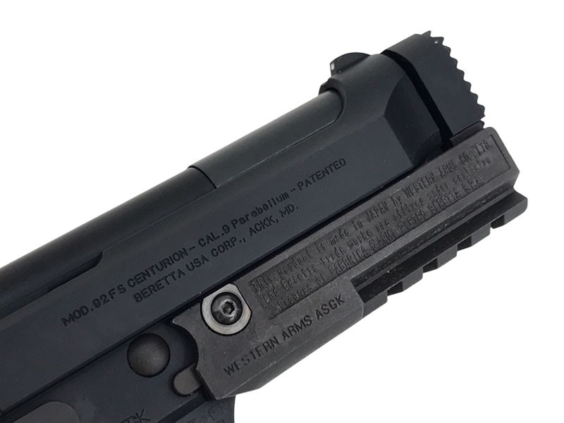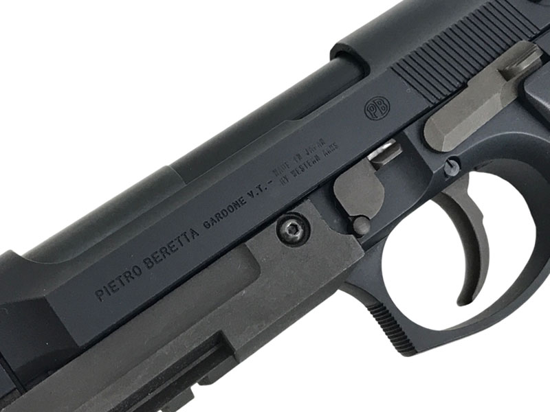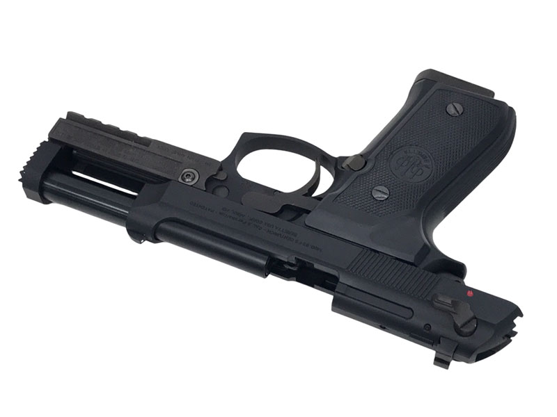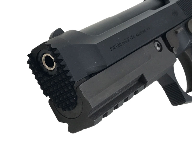 フロントのスパイクマズルガードとアンダーレールが特徴的。ハンマーもカットされており通常のM92FSをさらに戦闘力を高めたモデル。