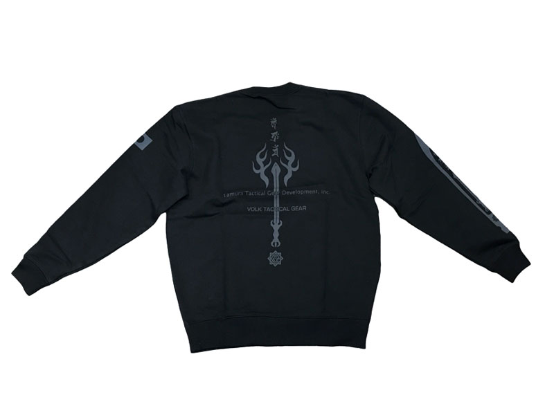 胸にはVOLK TACTICAL GEARと田村装備開発の頭文字を背中にはコラボロゴと、蜻蛉切のモチーフを左袖には日本国旗、右袖には蜻蛉切モチーフのデザインをプリント。