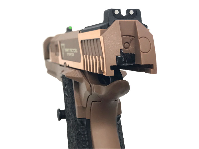 新設計のブローバックハウジングを搭載し、ダットサイトのマウント位置をリアルに再現。スライド側のサイトマウント位置には金属プレートをインサート成型しており、CO2の激しいブローバックに耐えうる十分な剛性を実現している
