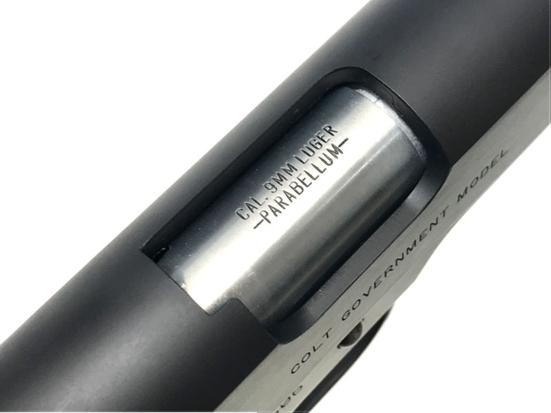 アルミ材削り出しで製作することでショートリコイル作動時の重量軽減が図られており、9mm仕様ならではのキレのあるシャープなスライド駆動を発揮するセッティングになっているのが特徴です。