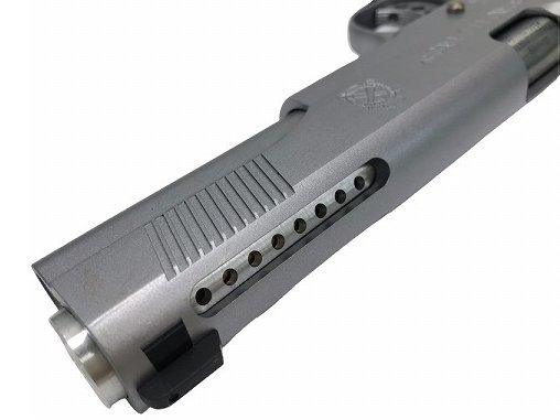 渋谷試作少量限定カスタム。重量感溢れるフロントへヴィなスライドサイズに加え、スライド上部に16(片側8)ものエグゾーストポートを備えるモンスター.45。