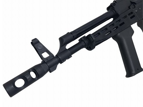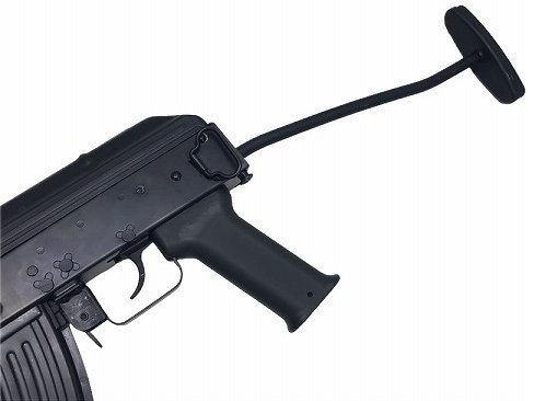 <実銃はこんな銃> AMD-65は、ハンガリーがAKをベースに将校や空挺部隊・特殊部隊用に設計したアサルトカービン。基本的な内部メカニズムこそAKM-63と全く同一であるものの、銃身長はさらに短縮され、バレルには左右に2つずつの穴が開いた大型のフラッシュサプレッサー兼用マズルブレーキを装着している。銃床は右折り畳み式となっており、セレクターの操作に干渉しないことを意識し独特の形状にデザインされている。