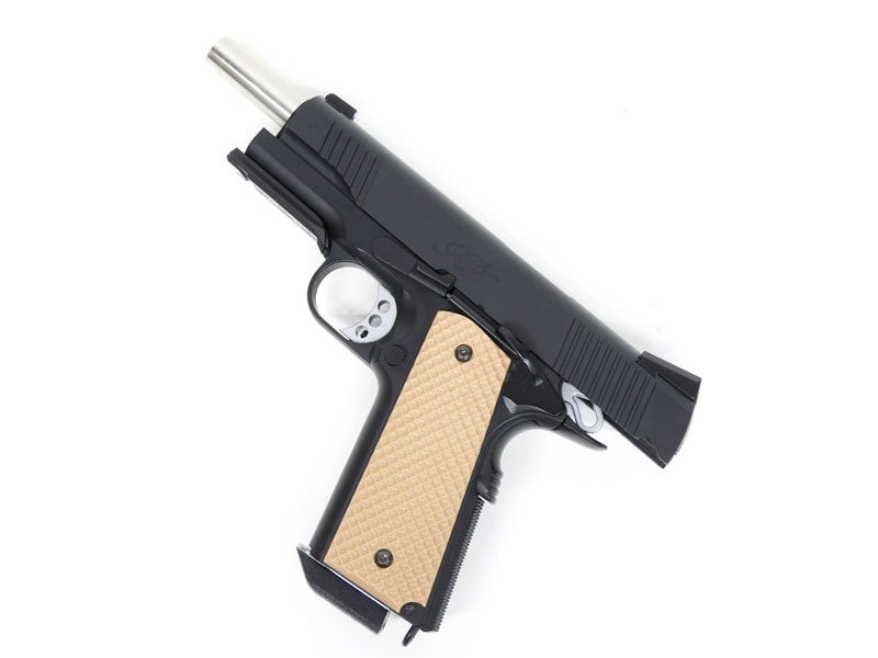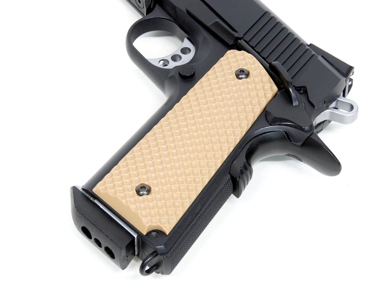 ベージュのカスタムグリップが印象的な銃。フレームの刻印やバレルの刻印までもしっかり再現している。