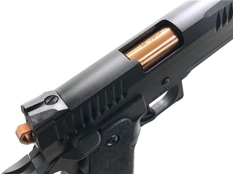 強化樹脂製スライドは大胆なカットでシャープなスタイル、集光アクリルフロントサイトを採用など、ホールド性に優れたテクスチャーグリップ、ホップアップはスライドを外さずにスライドストップで調整、などスタイルと性能を兼ね備えたカスタムモデル。