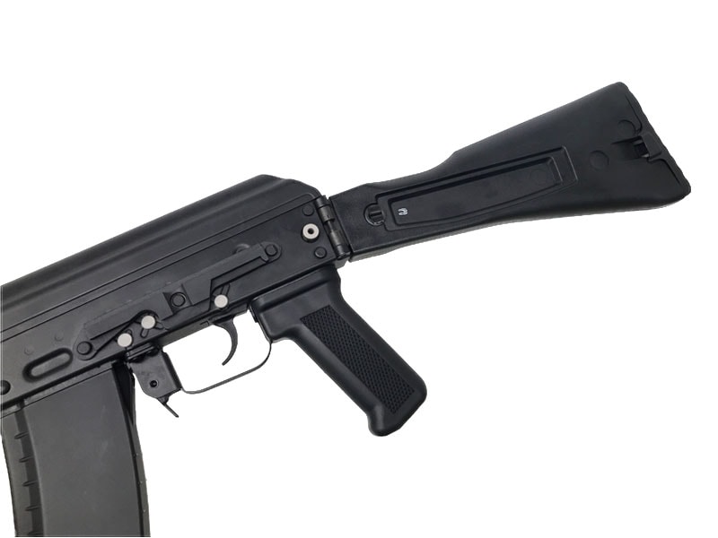 初期のAK74からは、ハンドガード、グリップ、ストックを黒色の特殊樹脂製に変更、ストックを左側に折りたたむ事が可能、レシーバーの左面に備わったマウントに対応するスコープ・ドットサイト・ナイトビジョンを装着可能な様に設計変更されている。