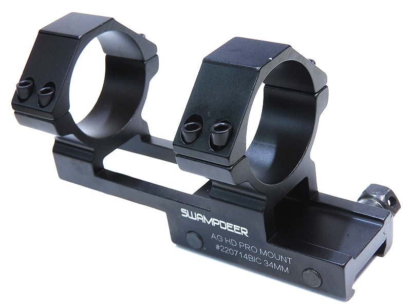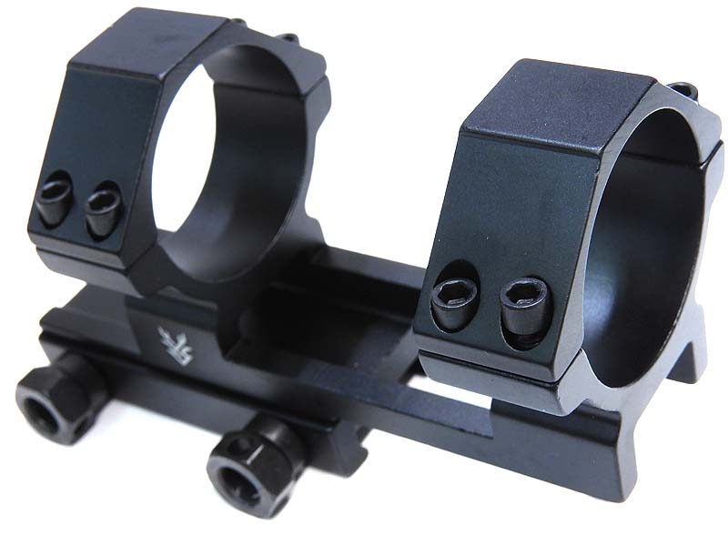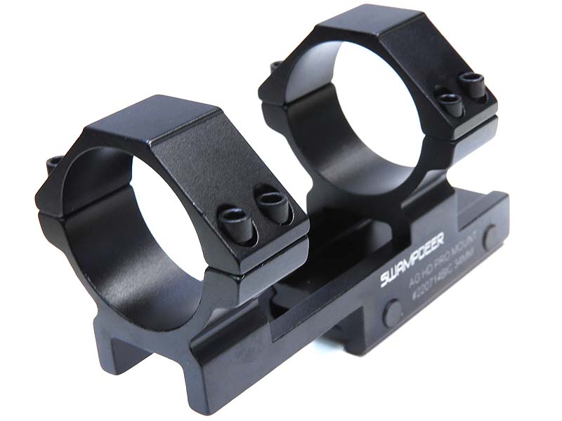 実銃用光学機器のメーカーSWANP DEER製のスコープマウント。フェイスガードやガスマスク装着時でもスコープが覗きやすくなるハイマウントタイプで銃側レール上面からマウントの円の中心まで約36mmとなっている。ワンピース構造なので信頼性の高いビルドが可能。
