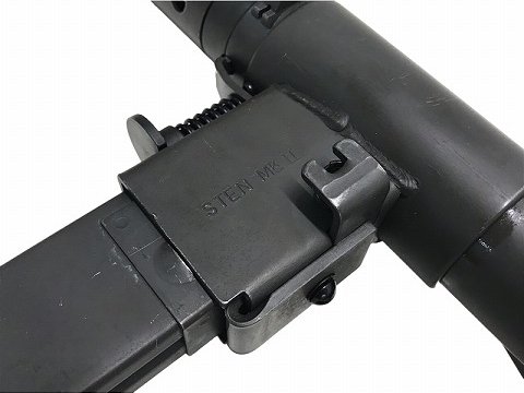 第二次世界大戦中のイギリスで開発された短機関銃 STEN MK2/ステンマークII ガスブローバックモデル!マガジンハウジング上部の刻印や、コッキングレバーが変更前の前期型仕様です。