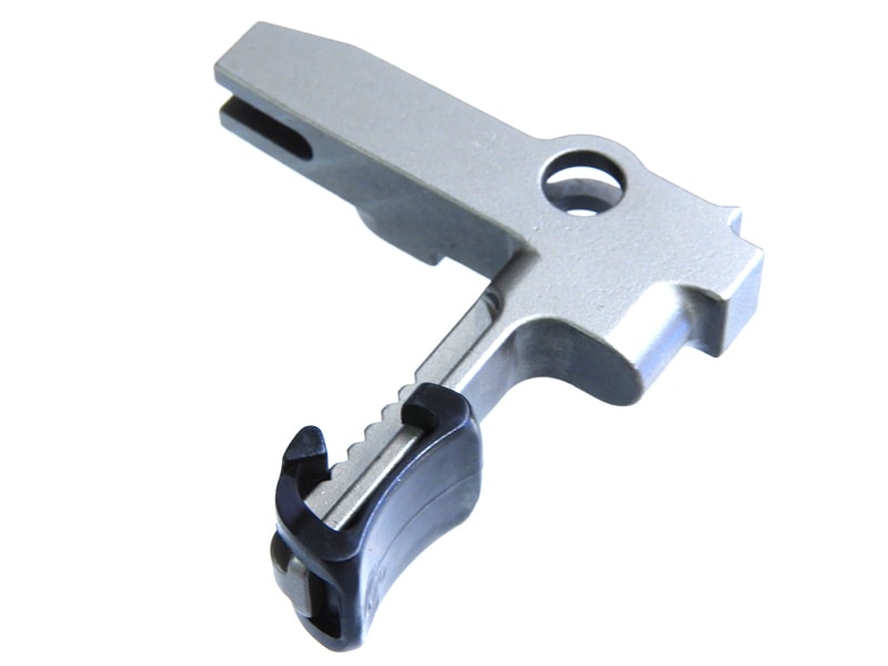 TTI JW3 MPXにも採用されているスポーツ向けストレートトリガー。実物同様にトリガーシューの位置を任意に変更できるようになっています。トリガーシューはブラック、レッドの二種類が付属。錆に強いステンレスをCNCで削り出した贅沢な一品。