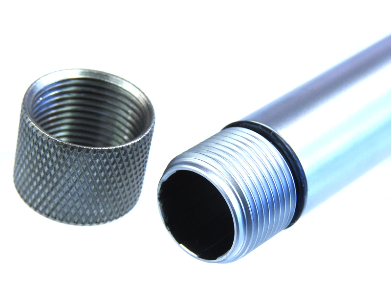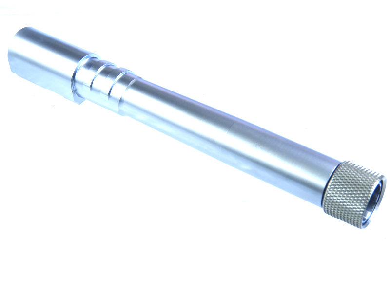KJ製 Cz SP-01 SHADOW ガスブローバック用のスレッドバレル。14mm逆ネジ仕様。 バレルはアルミニウム製で傷に強く、スレッドカバーはスチール製。シルバーカラー。