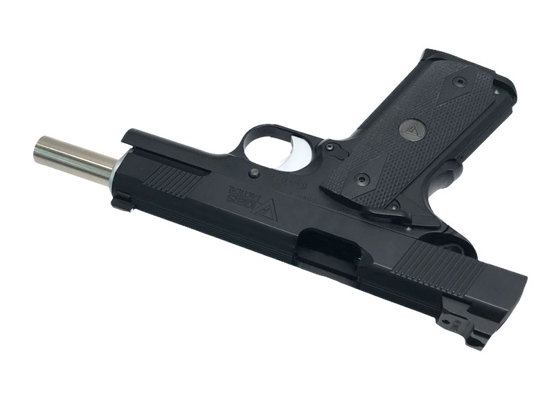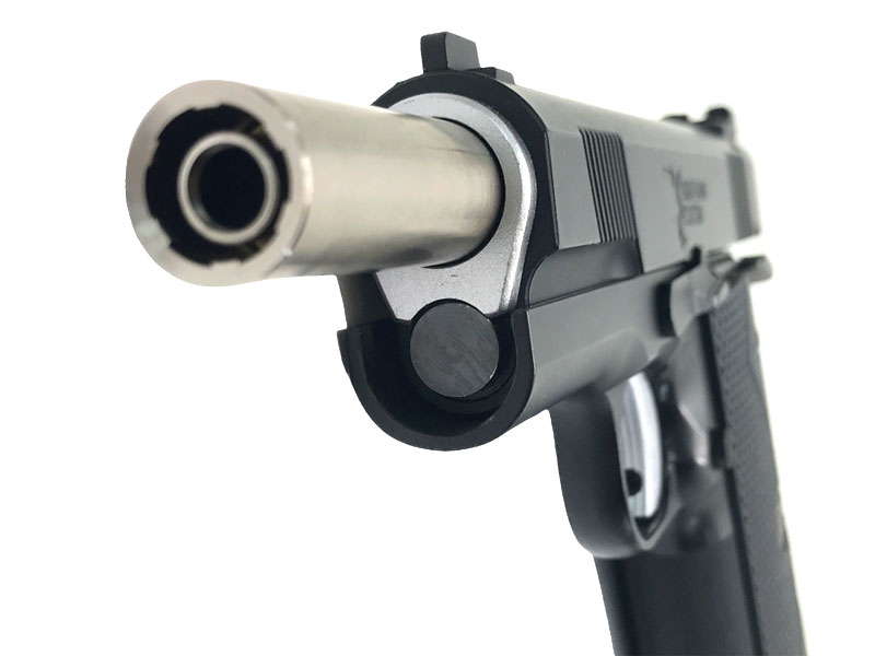 ハンドガンの場合は全体を金属性とする組み換え、エアソフトガンの場合は射出エネルギー0.98J以上にする改造を行うと銃刀法違反となります。HFC134a仕様のガスガンにCO2用マガジンを組み込む、スライドを金属製の物に差し替える等、簡易な改造でも罪に問われる可能性がございますので、絶対にお止めください。
