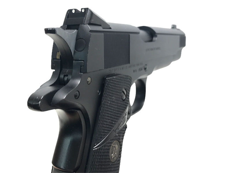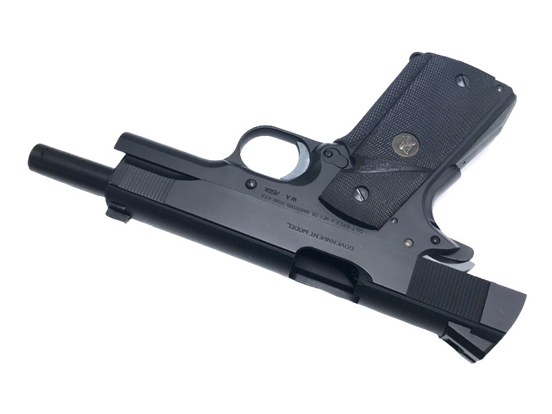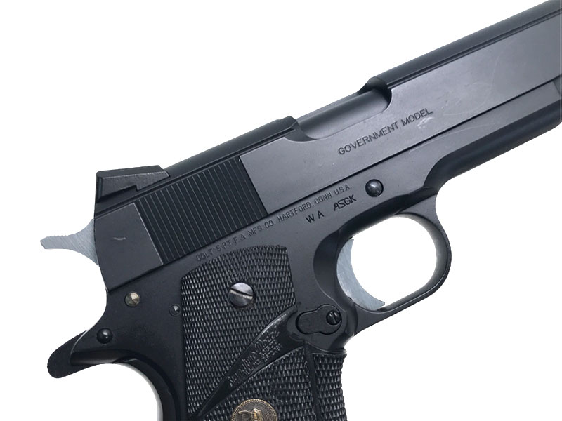 「あぶない刑事」の主人公が使うガバメントカスタムワイルドホーク。スライド"および"メインスプリングハウジング"を一つ一つノーマルスタイルパーツから削り出して製作。 特徴的なスライドのきりかきライン、ラブレスチックなハウジング。ガバメント・シリーズ80 カスタム、という目線でも魅力的で現在ではとてもレアな一品。
