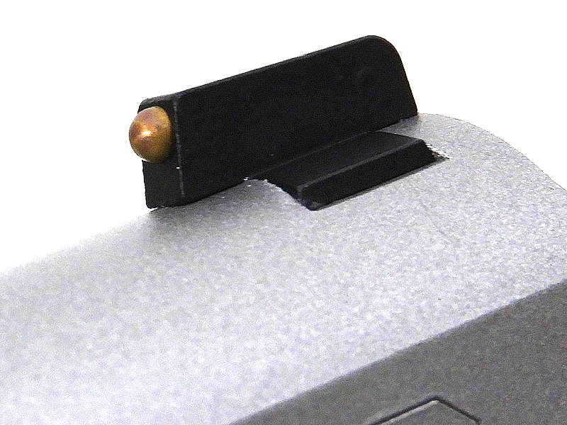 ノバックサイトとフロントサイトに埋め込まれたゴールドピンが目立つ。スライドのサイドにはノバックのロゴが誇らしげに刻まれている。