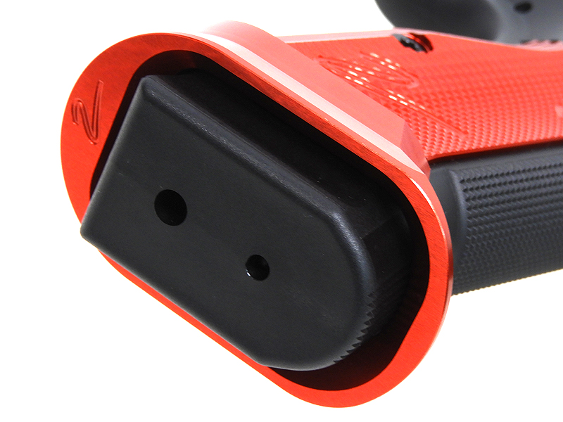 純正品の塗装グリップではなく、傷に強く、美しい仕上がりが特徴のレッドアルマイト加工が施されたアルミニウムグリップとマグウェルを採用。