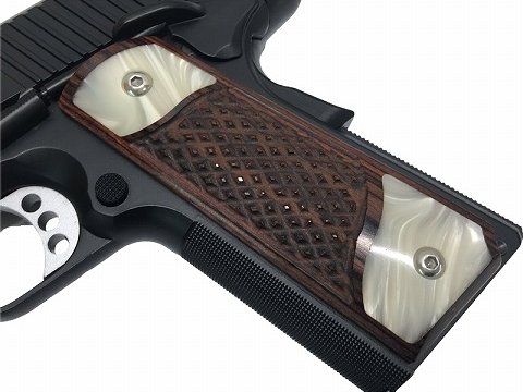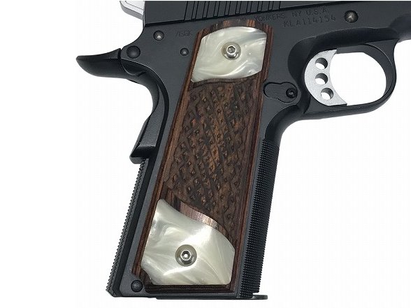 グリップが木製チェッカーグリップの上下にパールタイプのグリップが埋め込まれた物となっています。またグリップスクリューもそれに合わせてステンレスカラーの物に変更。