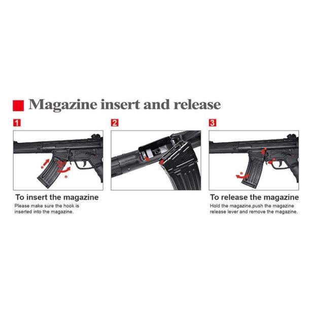 発射後のBB弾や排出されたカートは跳ね返る事があるので、必ず充分な強度のあるゴーグルを着用してください。
