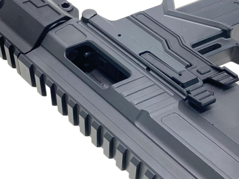 ロアレシーバーは各社ハイキャパシリーズのマガジンに対応、アッパーレシーバーは直線的なデザインで仕上げている。