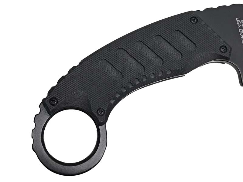 ブラックコーティング加工を施し大きな湾曲が特徴のカランビットナイフ。