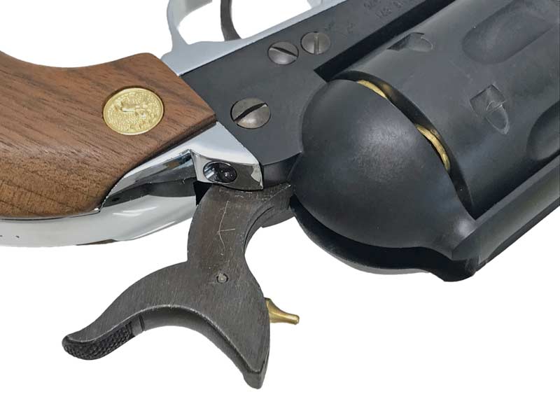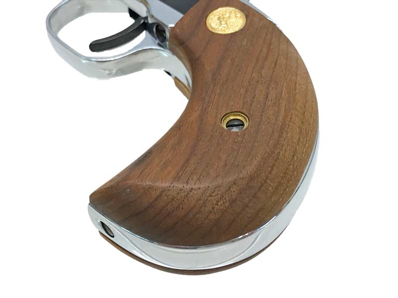 カスタム品詳細 トリガーガードからバックストラップまで純正のものからシルバーカラーのものに換装(パーツの詳細不明)されており、ラウンドバットにカスタムされています。