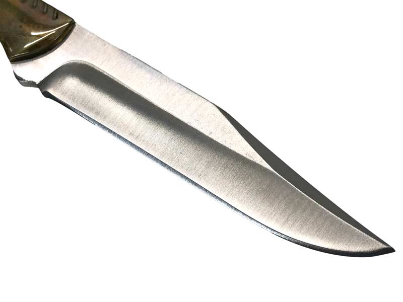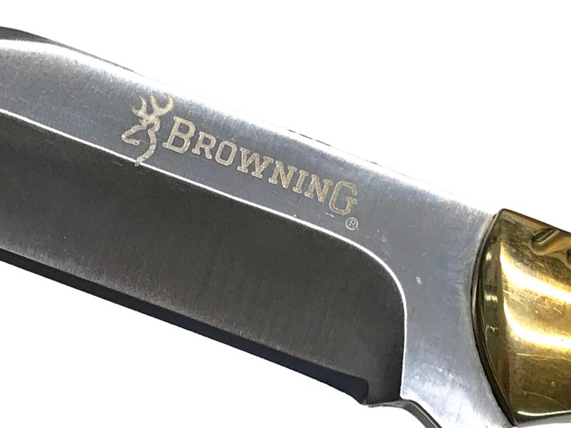 BROWNINGのモデル不明のフルタングナイフ。ステンレス製の両刃ブレードで、骨から皮を剥がしたりするのに最適なナイフ。フルタング構造でG10グリップ装備。濡れていても手に食いつき、刃先までしっかりと力が伝わる。レザーシース付き