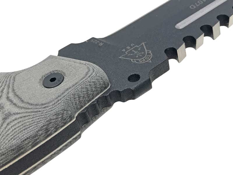 ブレードの背にはノコギリ状の加工が施されており、刃厚は約6.7mmと非常に厚みがあります。