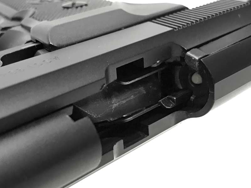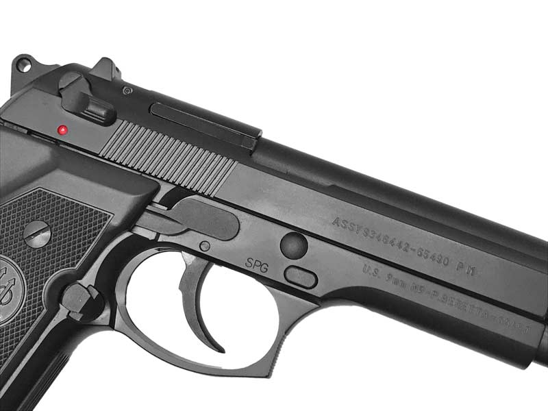 MGCの表現する M9 ボディには衝撃に強いABS樹脂を使用。実銃を忠実に再現した造形が魅力的である。フレーム、スライド、グリップパネルに至るまでしっかりと刻み込まれた刻印にはもちろん「P.BERETTA」の文字とベレッタ社のロゴが堂々と刻まれている。また、デコッキングはもちろん、ローディングインジゲーター、ファイアリングピン・キャッチまでも完全に再現。ボディはABSではあるが、負担のかかる可動部品は金属でできているため、強度、性能、質感も十分。性能とディティールにしっかりとこだわった逸品となっている。
