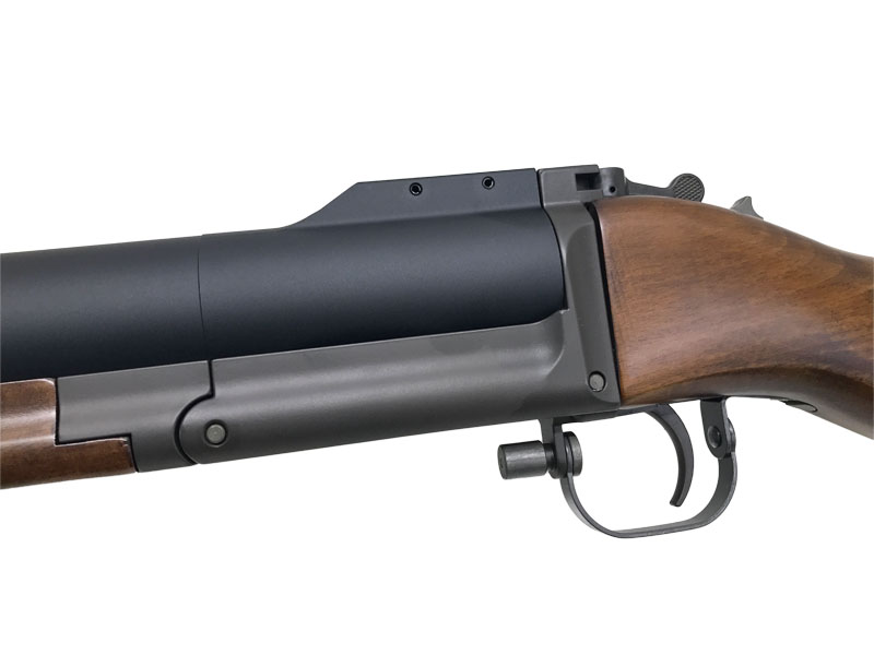 中折れ式を採用 しているため、 構造がとてもシンプル。 ベトナム戦争で大活躍したイメージが強いが、その後も長きに渡り採用され続け、 写真や動画にも度々登場。 製品は完全に台湾で生産され、 木製パーツはブナ材を採用し、 実銃の木パーツを製 造する工場で製造。 バレルと中折れ機構はアルミ製を採用。 特徴的なリーフサイトも フル可動で、細部まで細かく再現されております。 このM79本体は市販された各種 40mmカートリッジに対応ししています。