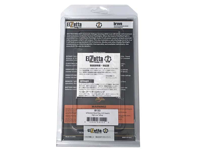 ELZATTA B133 BRAVO ELZATTA B133 BRAVOは耐久性に優れたアメリカ製のフラッシュライトで、2本のCR123A電池を使うスタンダードモデルだ。クリアなTIRレンズで集光性が高く、中距離照射に適しつつ左右や足元の死角を減らす配光を持つ。最大850ルーメンで約50分間安定した明るさを維持。操作はテールスイッチの種類で加圧式やクリック式、HI-LOW切替が選べ、オプションで使い分け可能。フラットなベゼルリングで威圧感が少なく、頑丈なボディと電子回路の樹脂封止で高耐久を実現