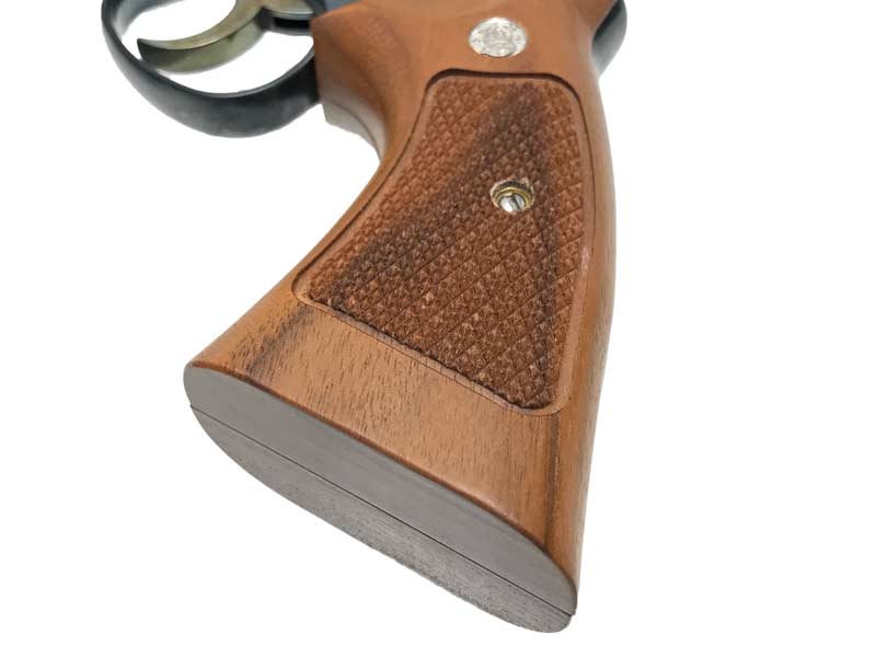 カスタム品 目を奪われるほど深く艶やかなブルーイングが全体を包み、トリガーとハンマーにはクラシカルな彩りを添えるケースハードン仕上げが施されている。さらに装備されたのは、手に馴染む重厚な質感のプラスウェイト木製グリップ。単なる外装カスタムにとどまらず、質感・重量感・視覚的満足感すべてにおいて一段上を行く、まさに“魅せるため”のフルカスタムモデルに仕上がっている。