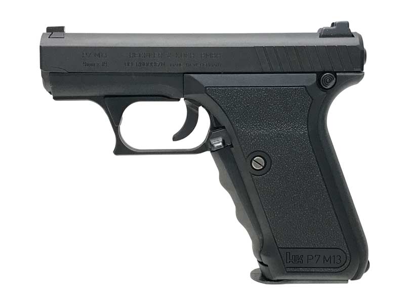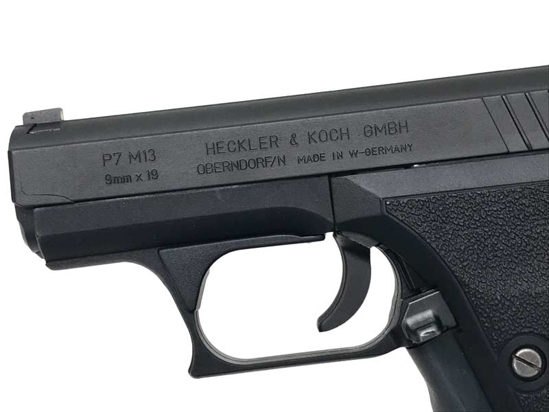 MGC H&K P7M13 スクイーズコッカー機構により、グリップを握るだけでセフティ解除から発射まで行える独自設計。ホールドオープン時もそのまま初弾を装填でき、操作性は実銃さながら。MGC製のため現在は入手困難。HW素材の重量感と鋭いブローバックが魅力の高完成度モデル。