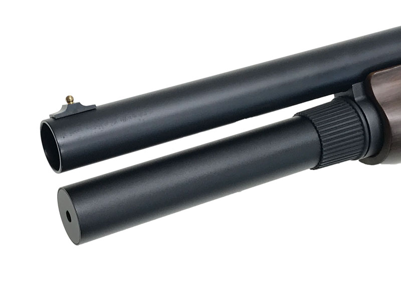 木目調の美しいストックのM870にエクステンションパイプを取り付けたカスタム品。付属マガジンは新品に交換済み。