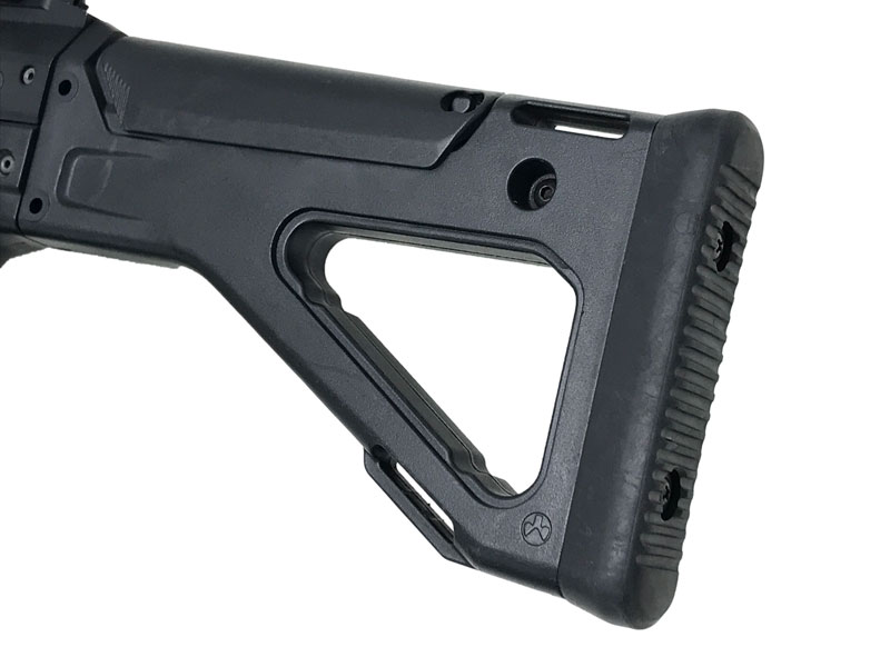 PTS 【MASADA SV】 MAGPUL PTS製 MASADA ACRのエコノミーモデル、ストリームラインVer.。ブラックカラー。旧MASADA同様の14.5インチバレルに固定ストック仕様。主要素材がミリタリーグレードのポリマーからトイガングレードのノンコマーシャルポリマー樹脂に変更されている。標準装備のMBUSリアサイトは別売。エマージェンシーフロントサイトも省略されている。いわゆる廉価版モデルだが、性能は維持されている。