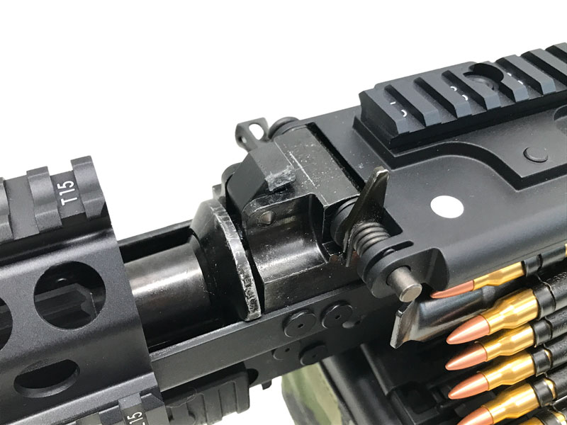 ベルトリンクのギミック:本体にセットしたマガジンからベルトリンクを引き出し、本体のフィードカバーを開いてベルトリンクをセット。金属製のダミーカートリッジを連ねたベルトリンクは、発射作動と連動してまるで給弾しているかのように動きます。