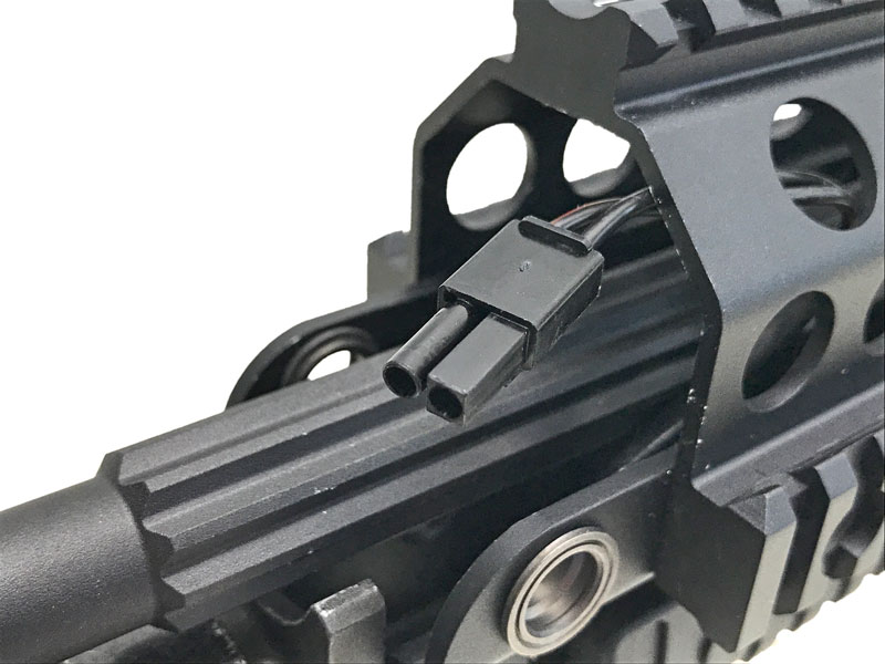 FET搭載:スイッチ部への負担を、FET(電子スイッチ方式)を採用することで軽減。また、バレル脱着時とフィードカバー開放時のトリガー機能OFF、連射マガジンの残弾ゼロを検知して作動が止まるオートストップシステム、FETとバッテリーの状況を表示するLEDインジケーターといったセンサーも備わっています。