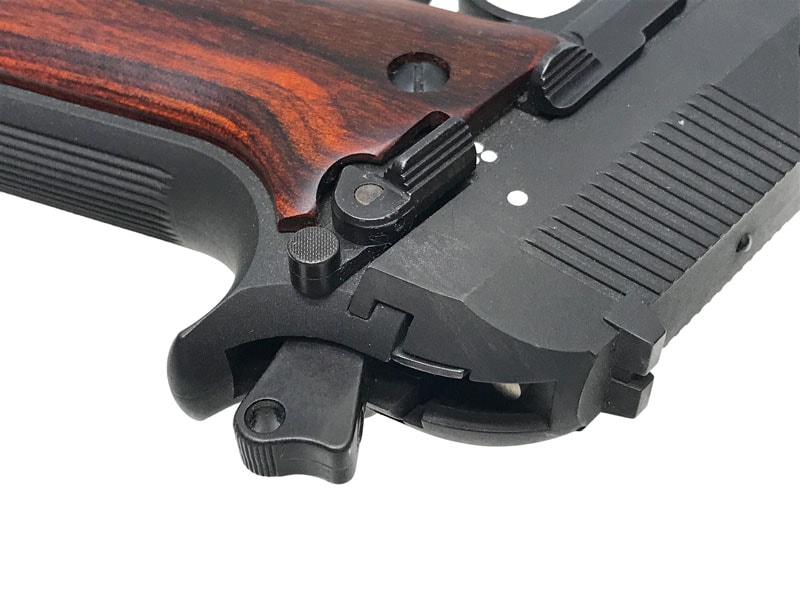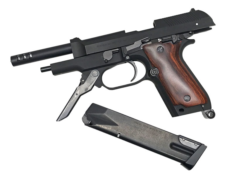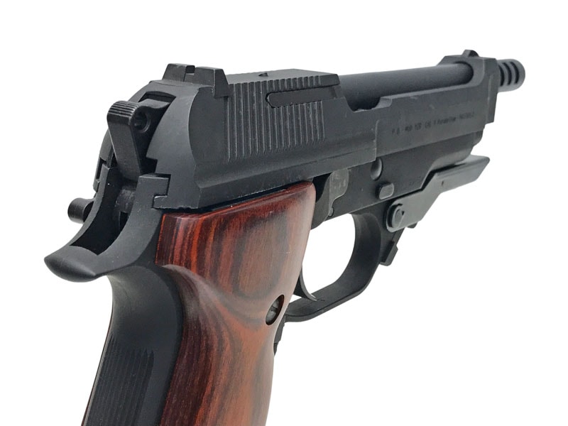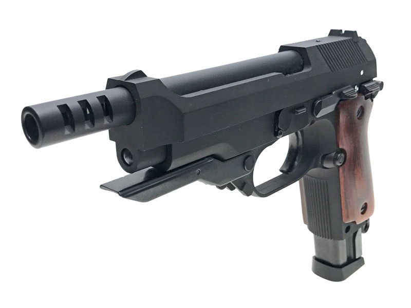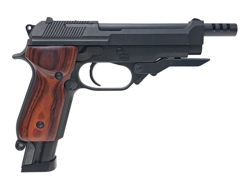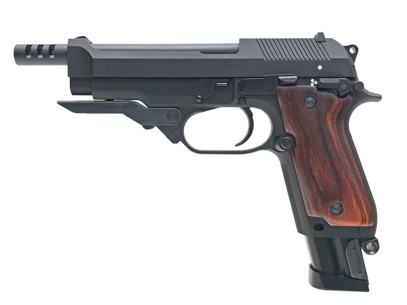 ガスポートが空けられたロングバレル、ロングマガジン、角張ったスライド、大型化されたトリガーガード、そしてプロトタイプならではのアルタモント社製・木製グリップが個性を主張!!
