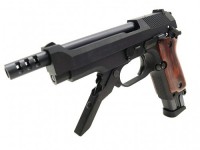 3点バースト発射の可能なマシンピストル・ファンの記念碑的アイテム、M93R。ファーストバージョンのアウターバレルの溝が四角穴が6個のタイプ。アルミ削出マグバンパー装備のプロトタイプ。アルタモント社製の木製スムースグリップ付属の限定モデル。